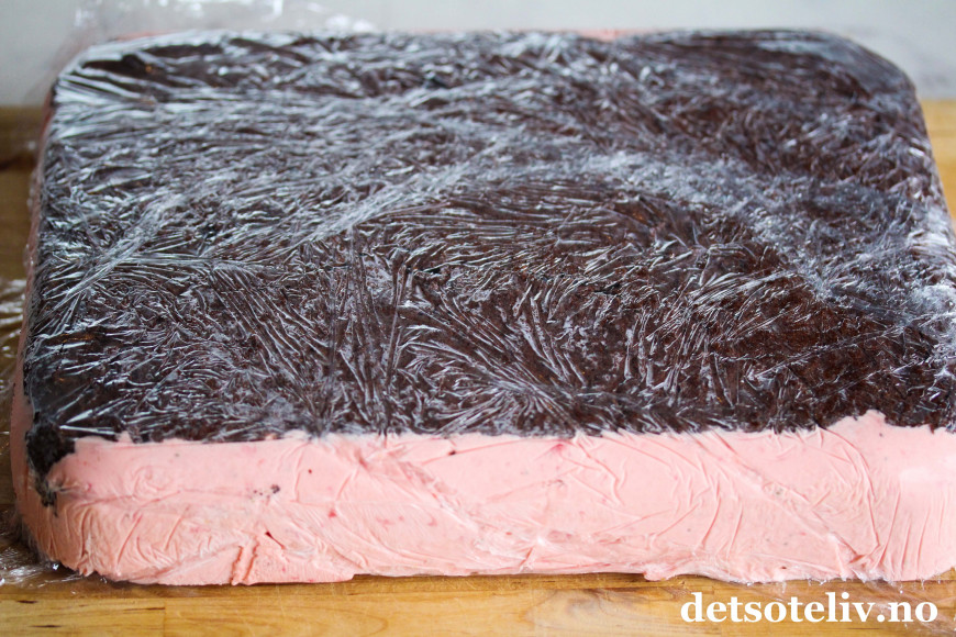 ♥ Merk at den frosne kaken kommer til å være steinhard når den tas ut av fryseren og må stå og tine en stund før den kan skjæres i firkanter. Bruk en stor, taggete kniv som du holder under varmt vann i springen ofte og tørker av, slik at kniven holdes varm og ren mens du skjærer.