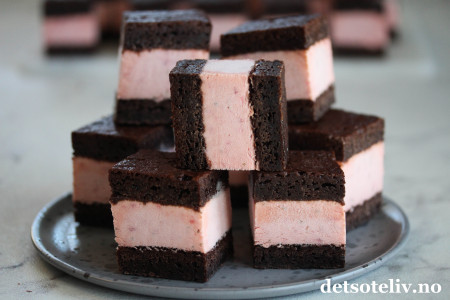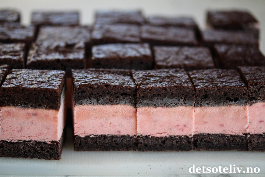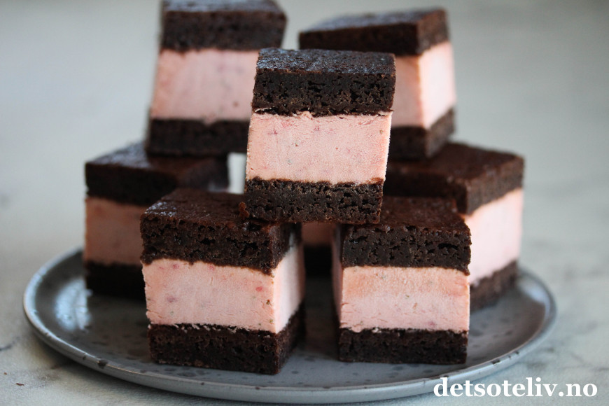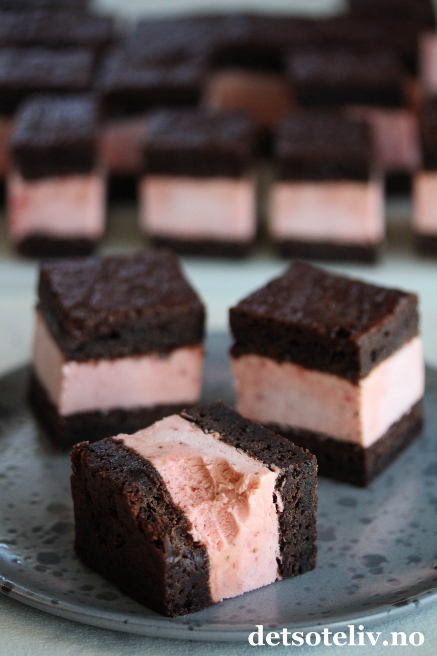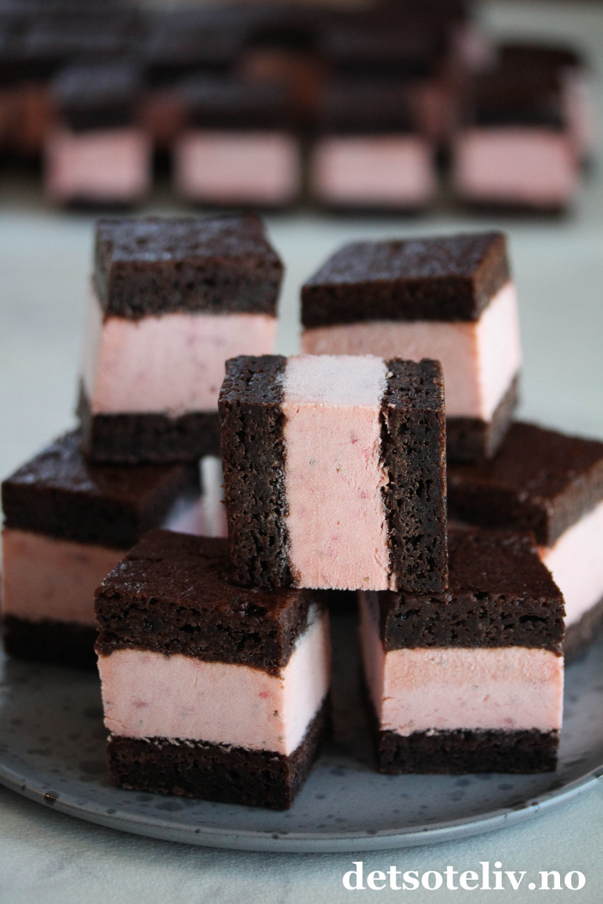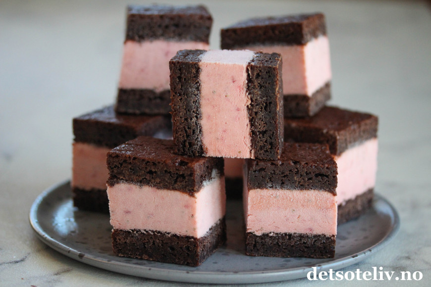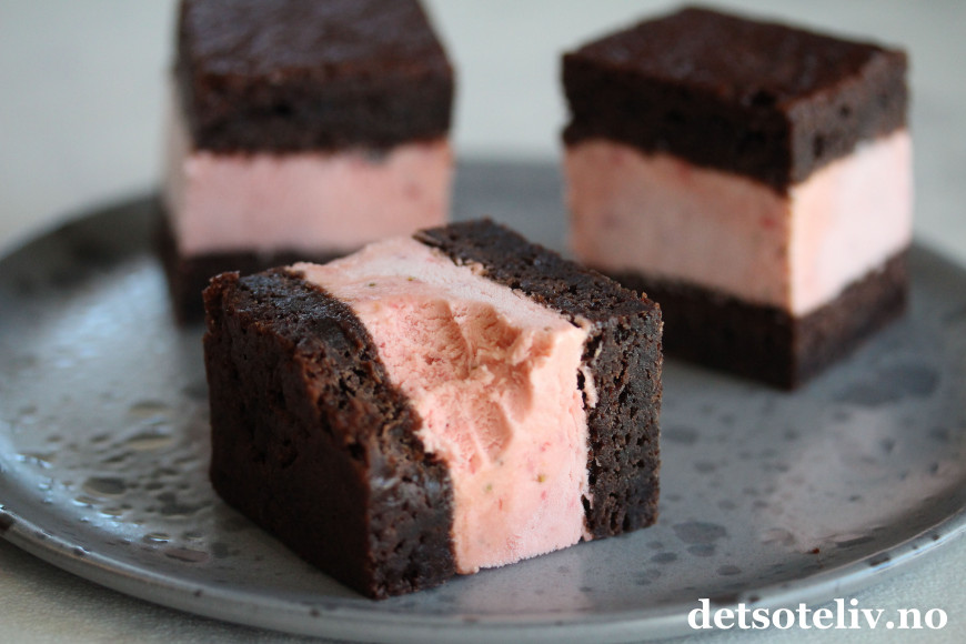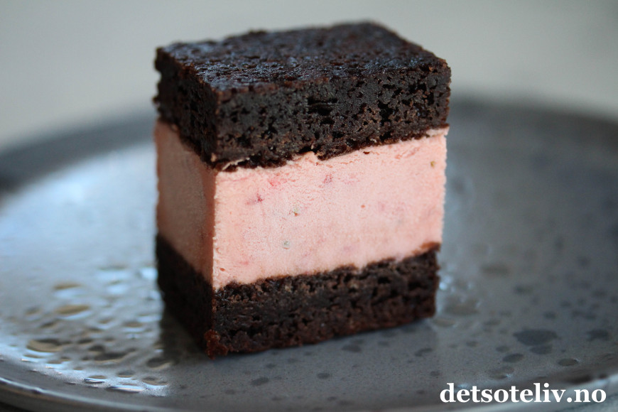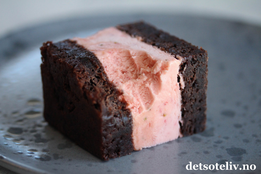 Da jeg postet oppskriften på superpopulære Sandwich-is med browniekake og vaniljeis for et par dager siden, lovte jeg dere å raskt også gi dere oppskriften på den andre varianten jeg testet ut med browniekake og jordbæris.