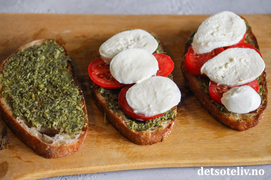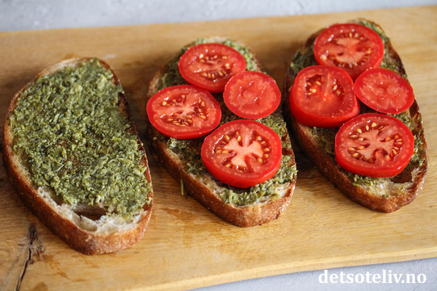 Stable de to skivene med topping oppå hverandre. Legg på den tredje skiven med pestosiden vendende nedover. Stikk gjerne en liten grillpinne ned i toasten for å holde det hele på plass.
