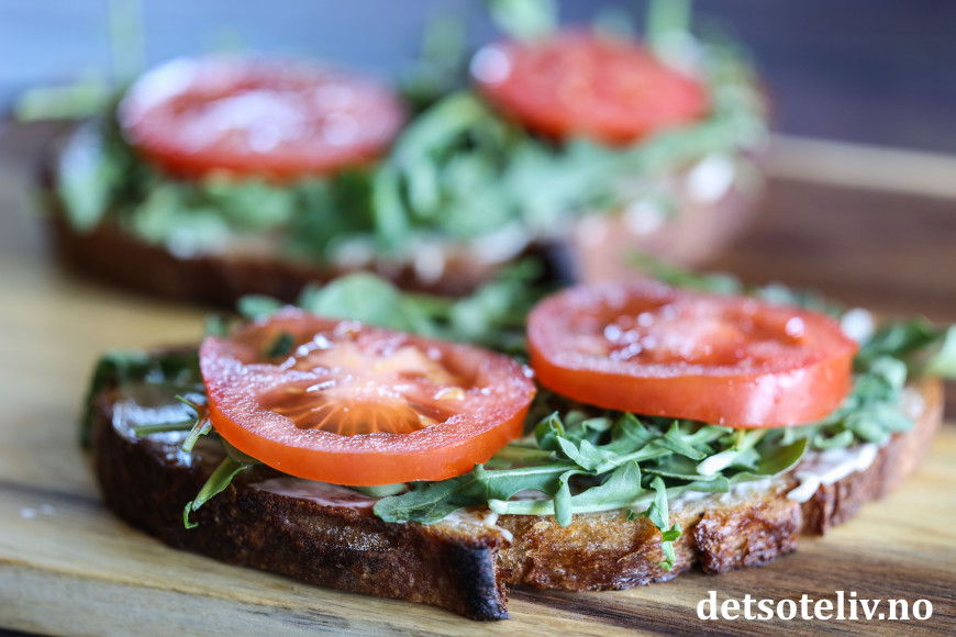 ♥ I stedet for surdeigsbrød kan du bruke annet rustikk brød, eller bruk italiensk ciabatta eller panini som du griller raskt i toastjern.