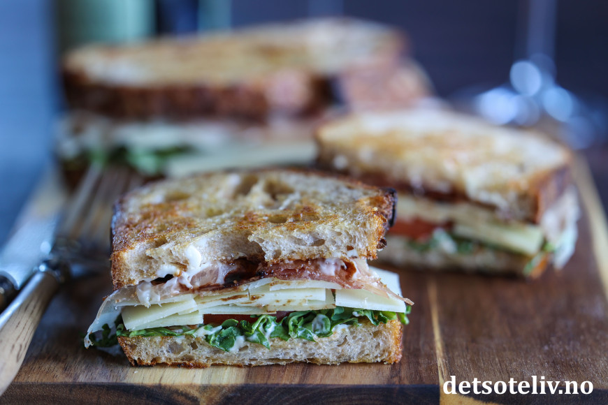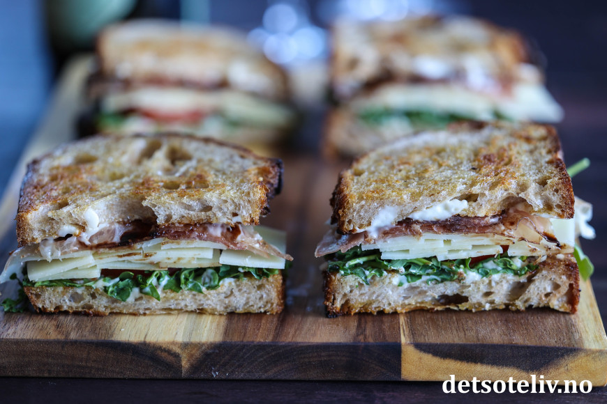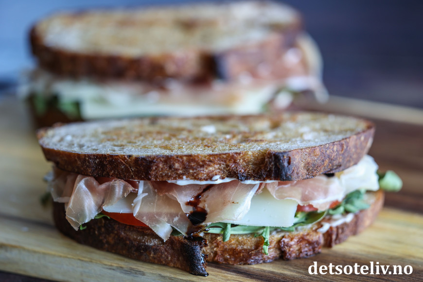 Italiensk spekeskinke, prosciutto crudo (bruk gjerne prosciutto di Parma, altså parmaskinke), passer veldig godt sammen med den italienske osten provolone. I tillegg er det godt med hvitløksmajones, ruccola, tomat og søt balsamico glaze. Legg dette lagvis mellom sprøstekte surdeigsbrød... nam!