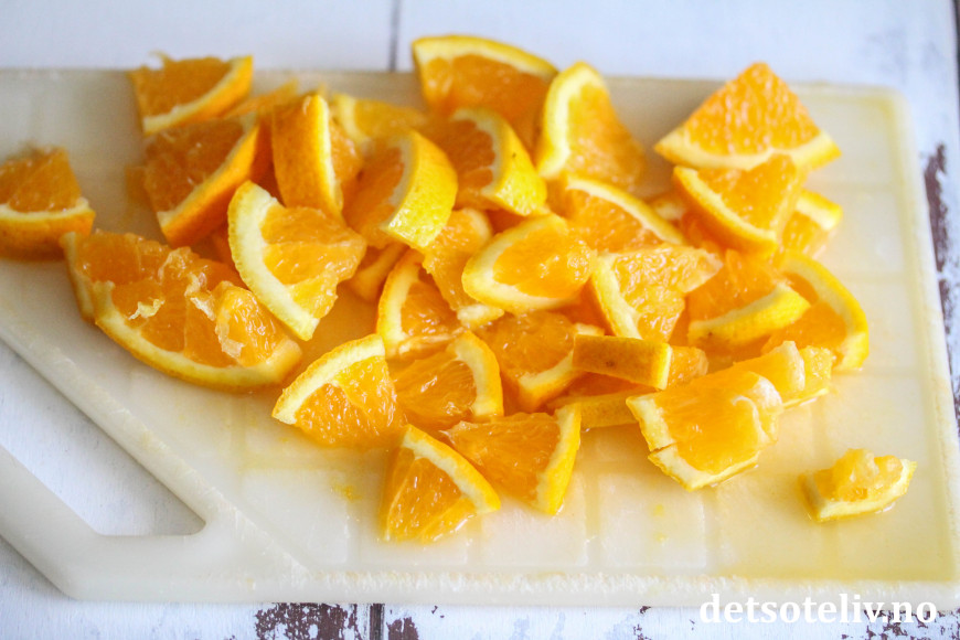 Skjær den andre appelsinen i skiver og deretter i små biter. Ha appelsinbitene i muggen.