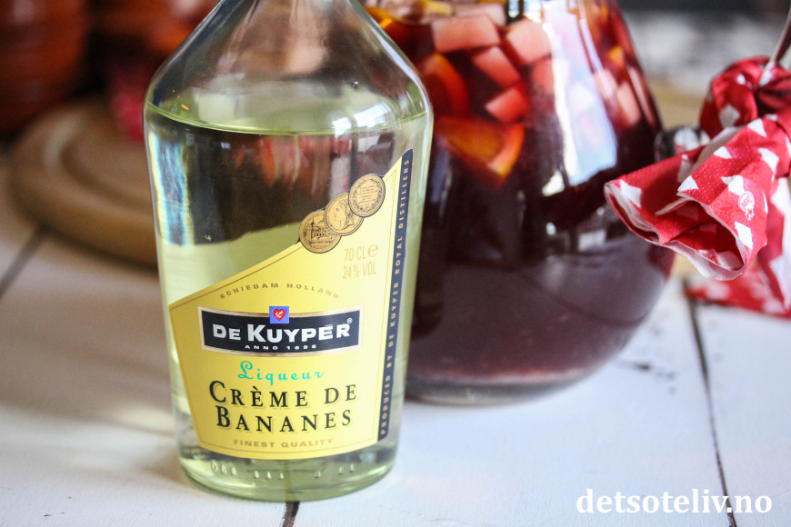 ♥ Personlig liker jeg også veldig godt å tilsette bananlikør i sangriaen. Det gir sødme og litt banansmak uten at sangriaen inneholder banan. Som et alternativ kan bananlikør byttes med mer brandy (slik at det blir 2 dl brandy til sammen), og så kan man ha skiver av en halv banan i muggen sammen med eple- og appelsinbitene.
