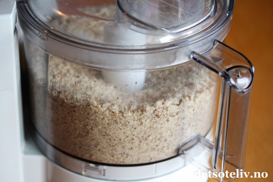 Ja, jeg har brukt food processor til mandlene her (men det gamle bildet jeg hadde før som jeg også har tatt med i dette blogginnlegget, viser samme kake laget med malte mandler i mandelkvern). Begge deler blr bra, men litt grovere mandelbiter om du bruker food processor.