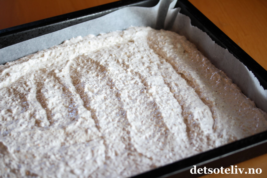 Fordel deigen i en stor, bakepapirkledd langpanne (ca 30 x 40 cm).