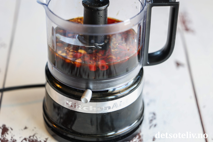 Kjør dette raskt sammen i en liten food processor eller med en stavmikser. Sil blandingen slik at du får en klar saus og ha den i en skål.