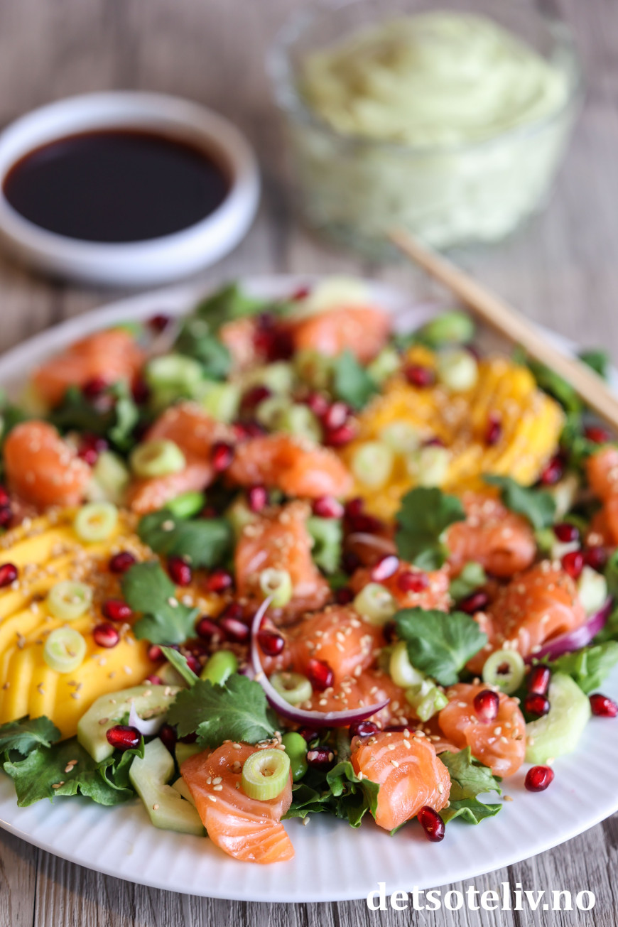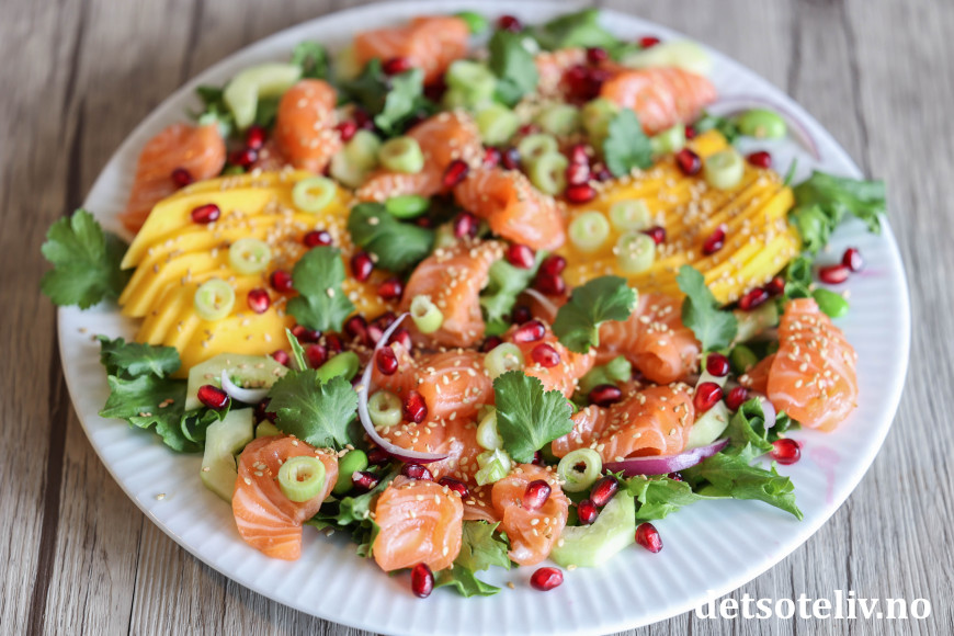 Denne salaten består for øvrig av sprø crispisalat, agurk, mango, vårløk, edamamebønner, rødløk, granateplekjerner, koriander og sesamfrø.