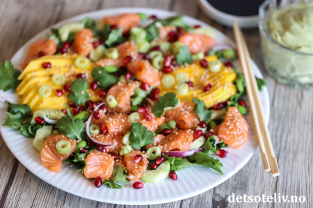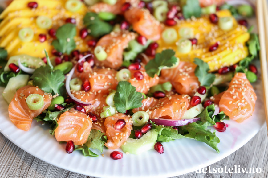 ♥ Sashimisalaten kan oppbevares i kjøleskapet i et par timer (dekk da til med plastfolie), men bør serveres samme dag.