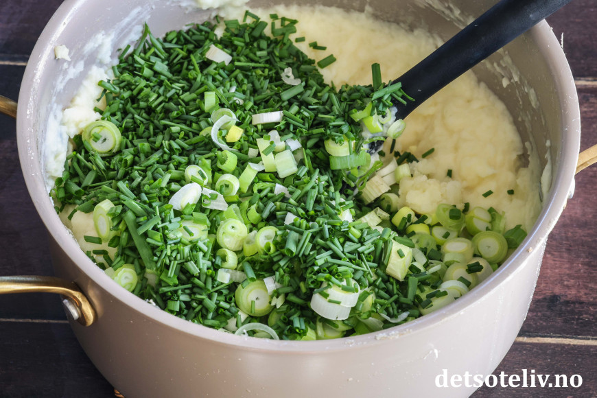 Når potetene er møre, siler du vekk vannet. Mos de varme potetbitene med en potetstamper. Ha smøret i kjelen, og bruk potetstamperen til å mose smøret jevnt inn i den varme potetmosen ettersom det smelter. Bland deretter inn melk og kremfløte. Vend deretter inn finkuttet vårløk og gressløk. Smak til potetmosen med kvernet salt og pepper.
