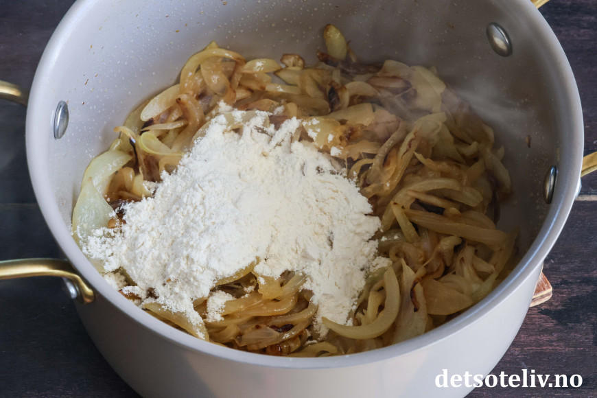 Spe deretter med kjøttkraft og rør om. Gi sausen et oppkok og la småkoke i ca. 10 minutter, til du får en tykk, brun løksaus.