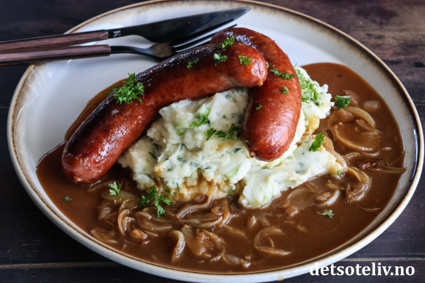 Som tilbehør er det populært å servere Onion gravy, som er en tykk, mørkebrun saus med masse karamellisert løk. Skikkelig godt! Du kan alternativt bruke Ølsaus med løk (Guinnessaus).