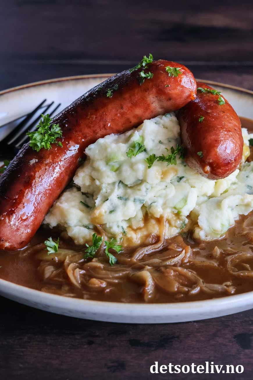 Legg en stor og god klatt Champ på tallerkenen og topp med nystekte pølser og server varm løksaus ved siden av.