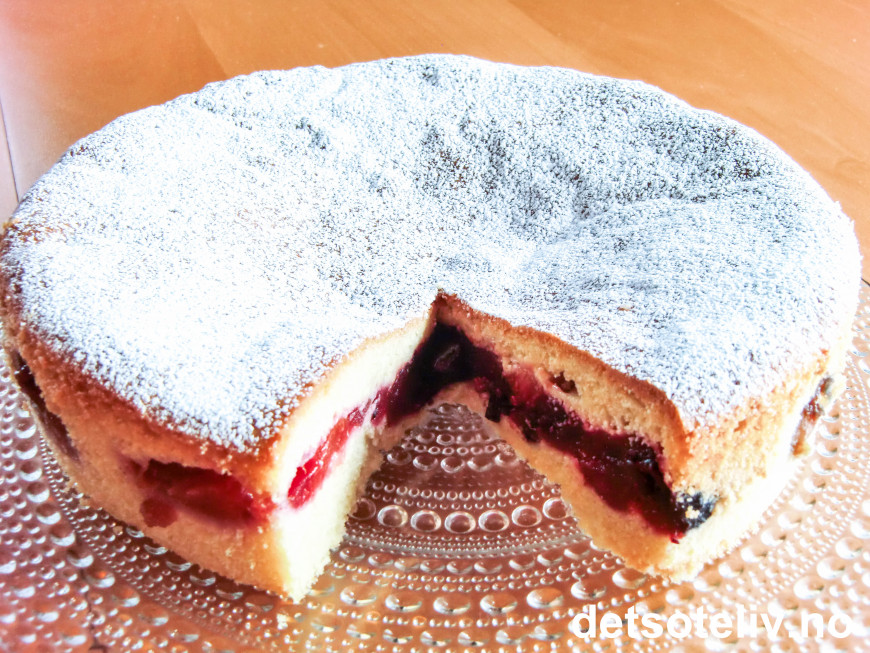 Ha halvparten av deigen i en rund form (26 cm i diameter) med bakepapir i bunnen. Fordel plommefyllet over deigen. Ha så over resten av deigen. Jevn til overflaten med en kniv.