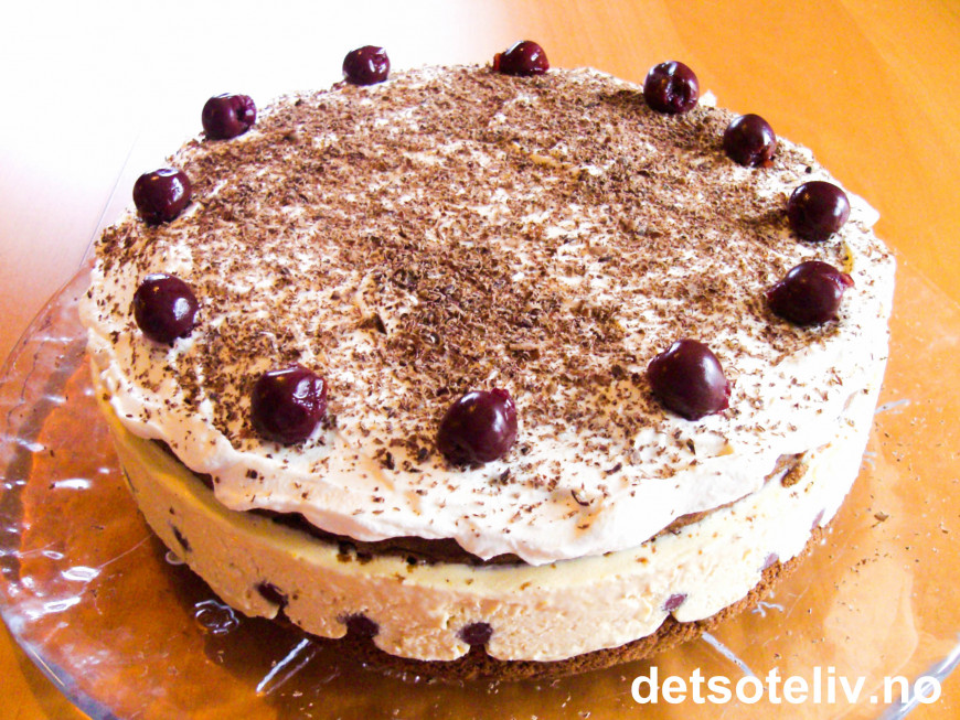 Før servering tas den frosne kaken ut av formen og settes på et passende kakefat. Dekk kaken med et lag pisket kremfløte og dekorer med revet sjokolade og hermetiske kirsebær.