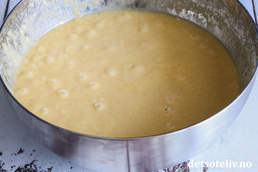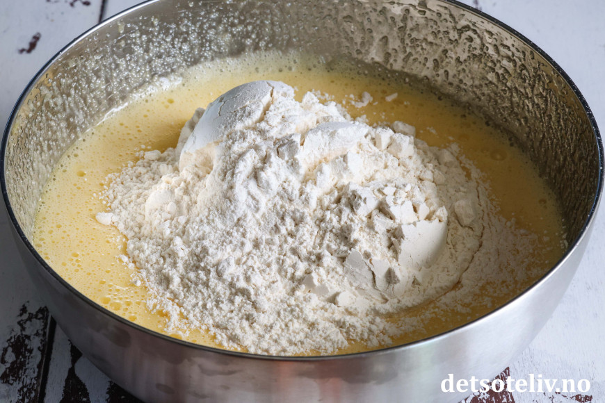 Bland så inn hvetemelet. Rør til du får en klumpfri røre.