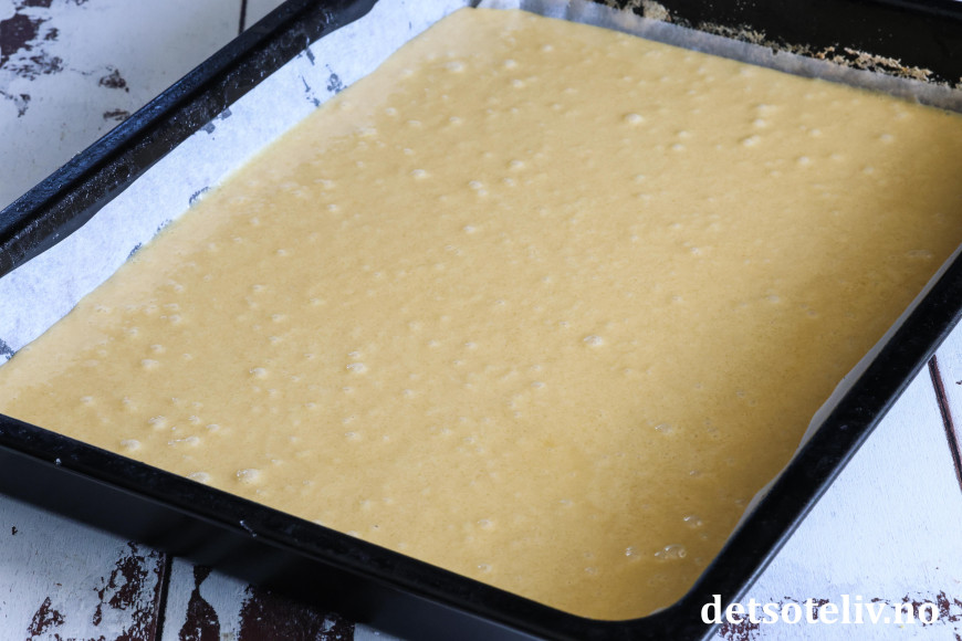 Ha kakedeigen over i en stor, bakepapirkledd langpanne (ca. 30 x 40 cm).