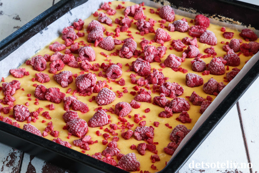 ♥ Selv om det står at det brukes fryste bringebær, går det også fint å lage denne kaken med friske bringebær. Merk at fryste bringebær ikke skal tines før de legges på kaken.