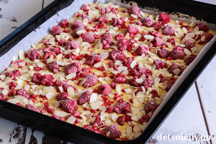 Dryss over fryste bringebær (de skal ikke tines først) og deretter mandelflak.
