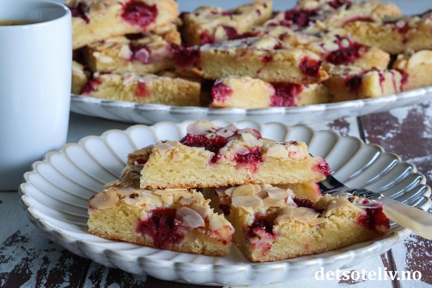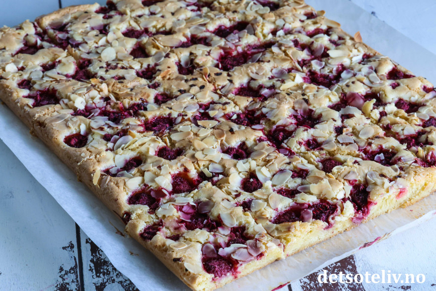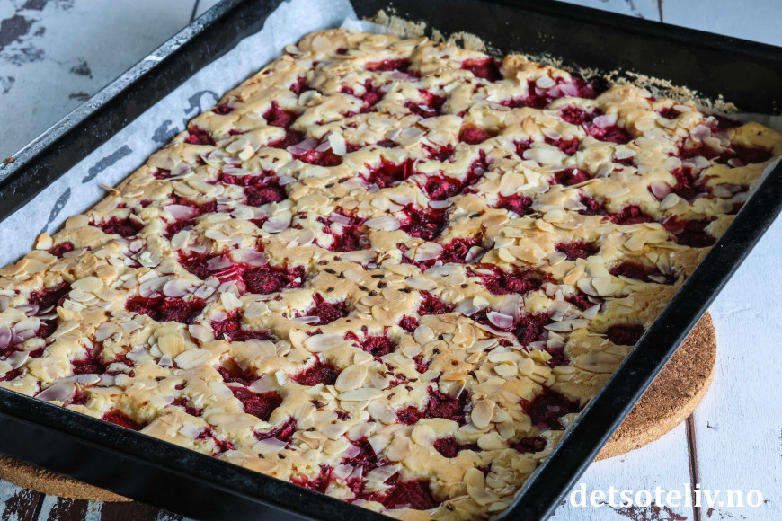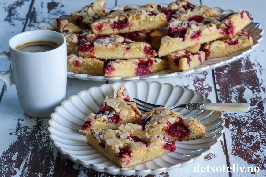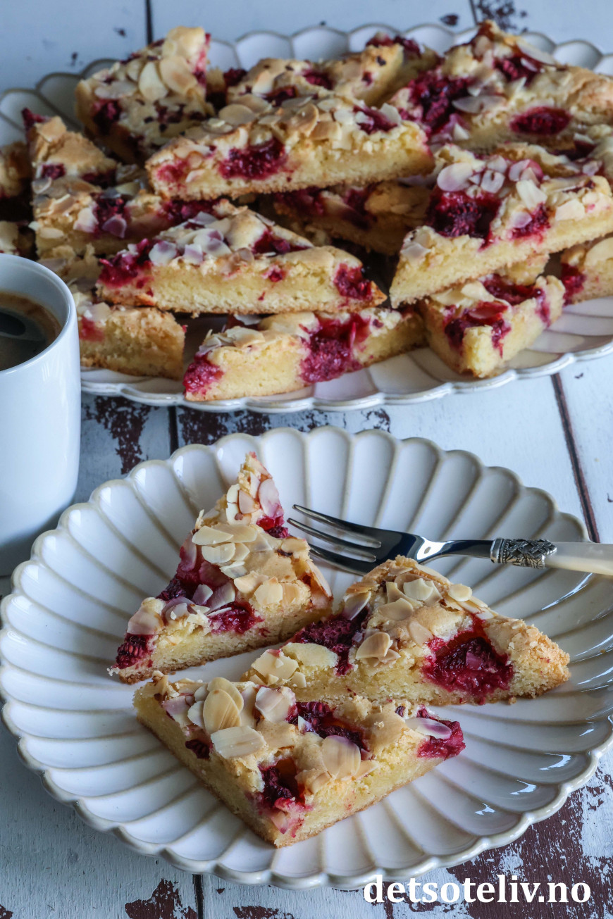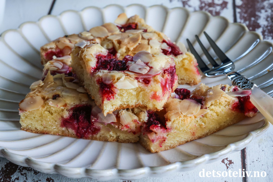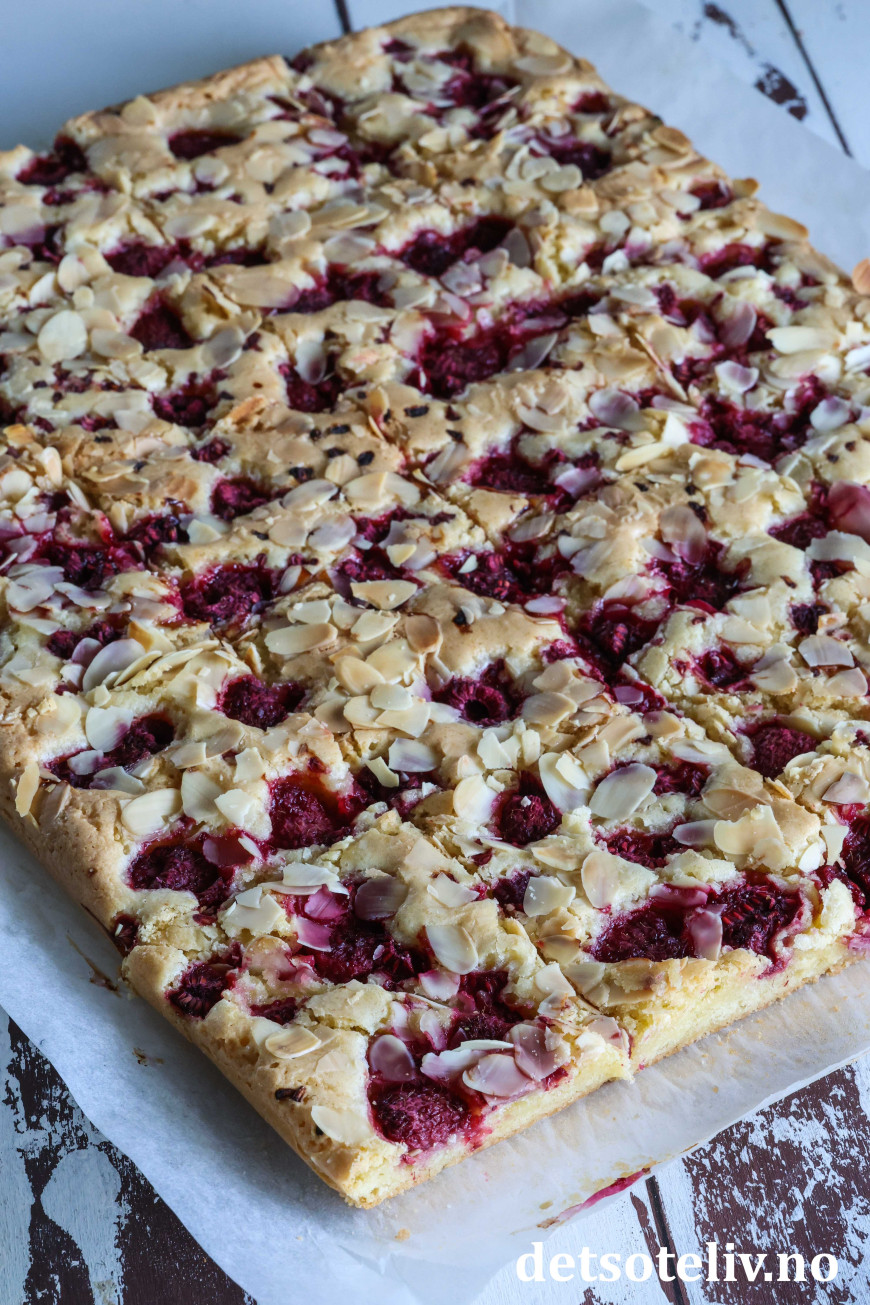 Som du hører er dette en svensk oppskrift ("hallon" er bringebær på svensk). Kakedeigen skal bare røres raskt sammen og gir en søt og litt seig kake. Det går kjempefint å bruke frosne bringebær, så denne kaken kan lages året rundt! Kaken stekes i stor langpanne, og om du skjærer kaken opp i trekanter eller firkanter, er ærlig talt ikke så nøye. 😊