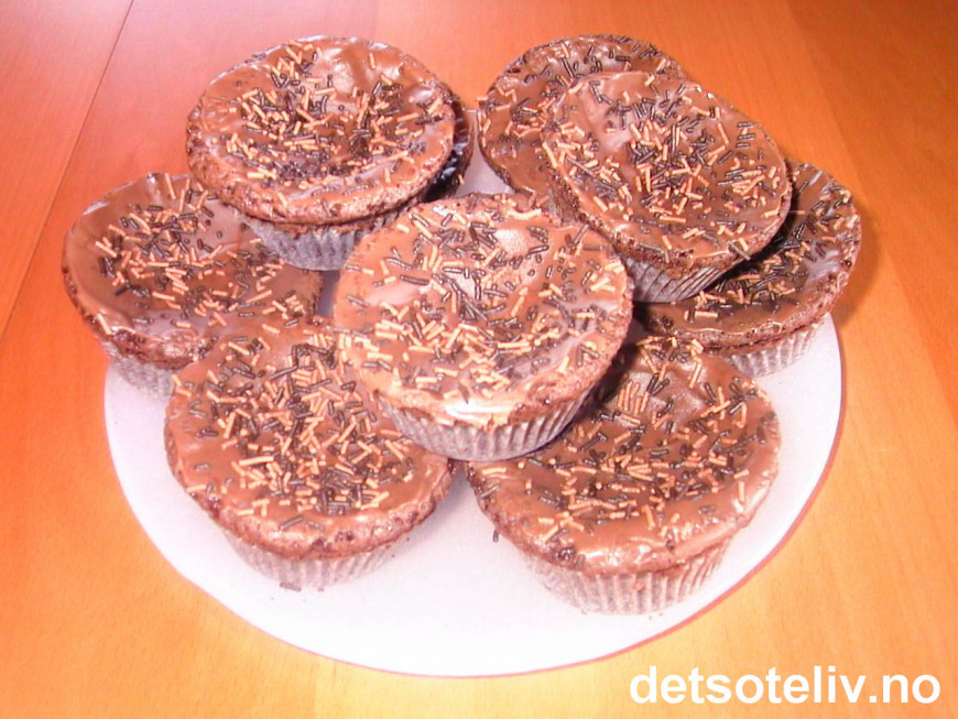 Muffinsene hever seg under steking, men faller så noe sammen igjen etterpå. Det er helt normalt. De kommer dessuten til å sprekke opp på overflaten, men det blir jo dekket over med melkesjokoladen. Vær også klar over at muffinsene virker litt ustekte når de tas ut av ovnen, men de festner ved avkjøling.