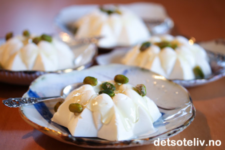 Pynt med flytende honning og pistasjnøtter.
