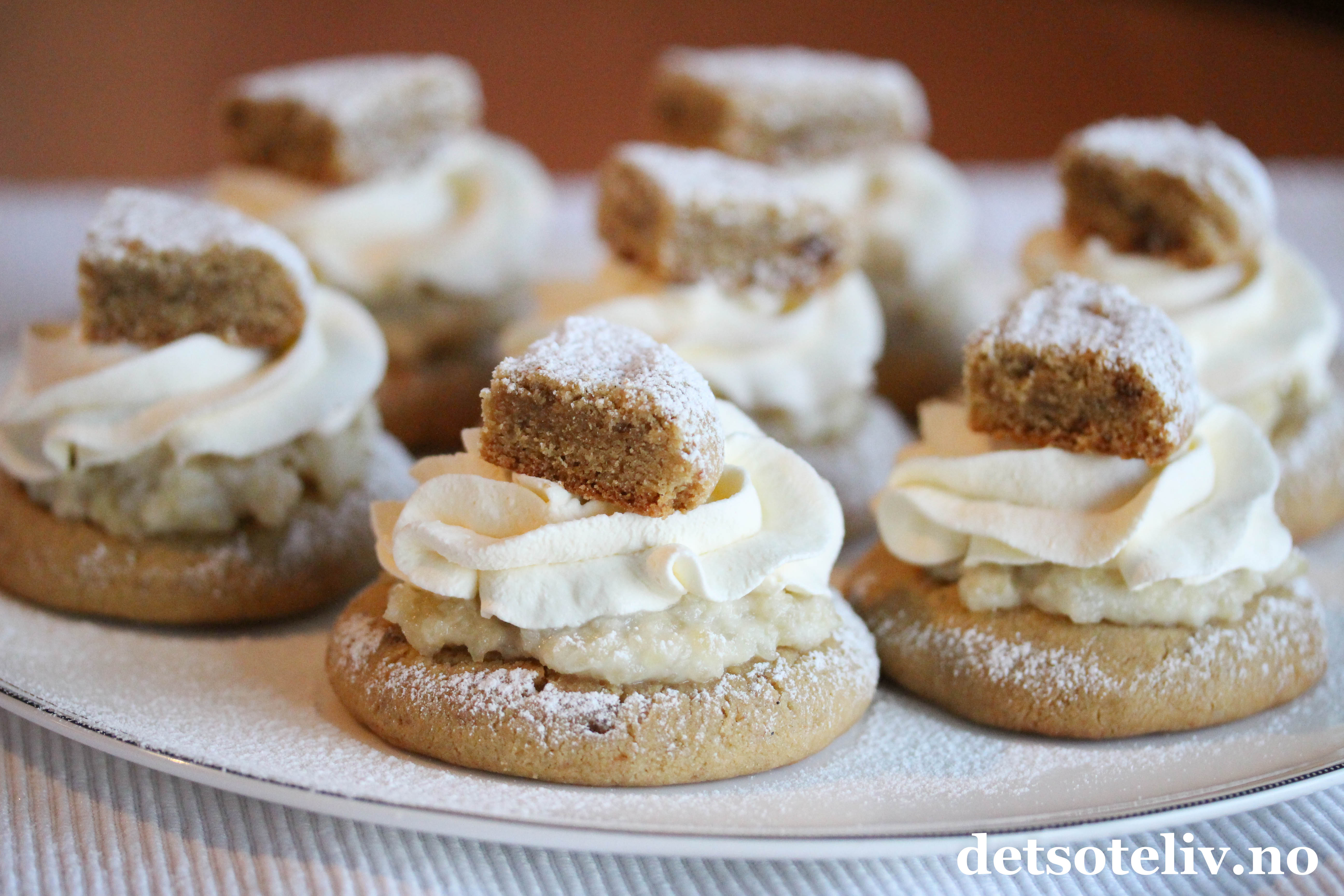 ♥ La kakene bli helt kalde før du dekker dem med mandelmasse og krem, eller kommer kremen til å smelte.