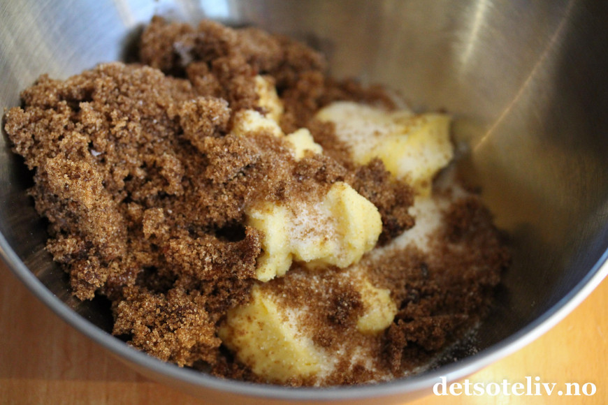 Ha mykt smør, hvitt sukker, brunt farin og egg i en bolle.