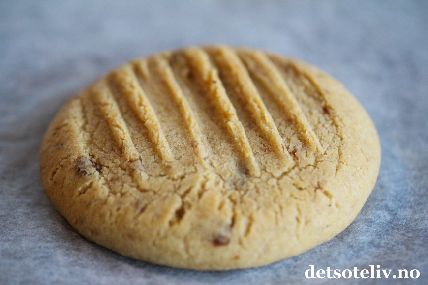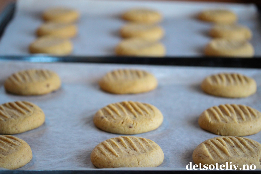 Del deigen opp i 18 like store emner og trill dem til kuler. Fordel dem på to bakepapirdekkede stekeplater (9 stk på hver) og trykk kakene lett ned med en gaffel så de blir litt flatere.