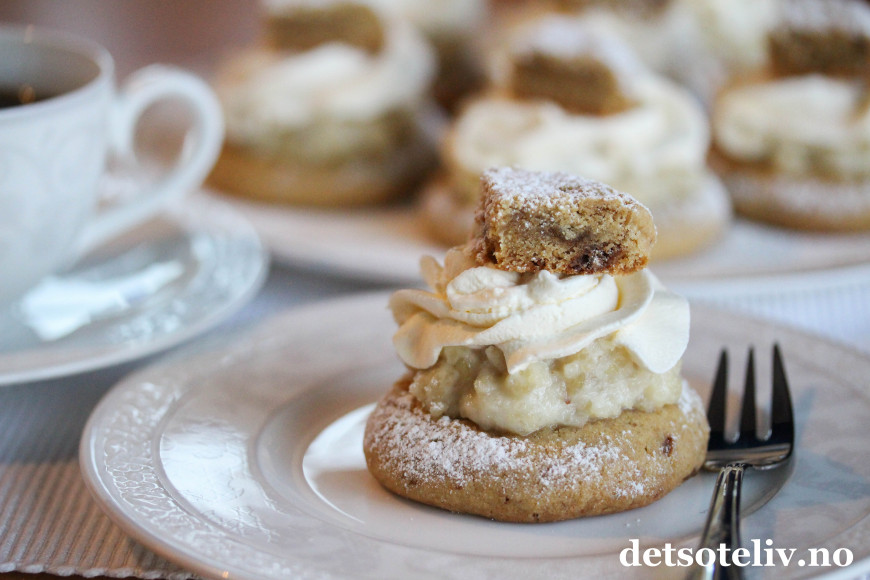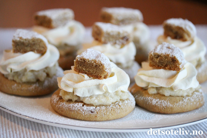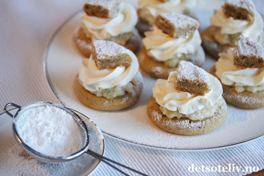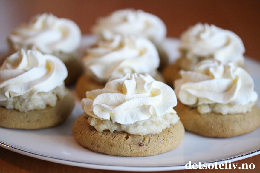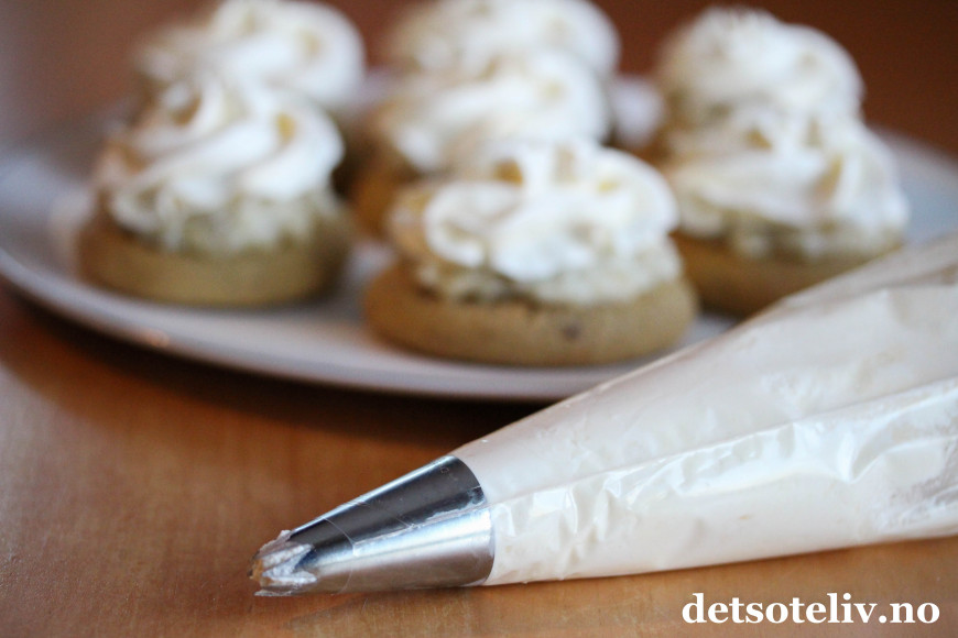 Pisk kremfløten til fast krem. Sprøyt en lekker kremtopp på hver cookie.