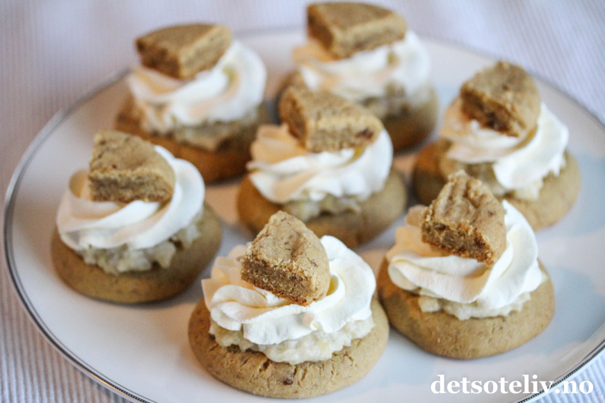 Pisk kremfløten til fast krem. Sprøyt en lekker kremtopp på hver cookie og legg en kvart cookiebit på toppen av kremen.