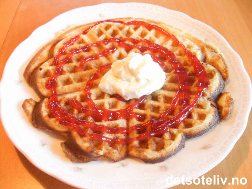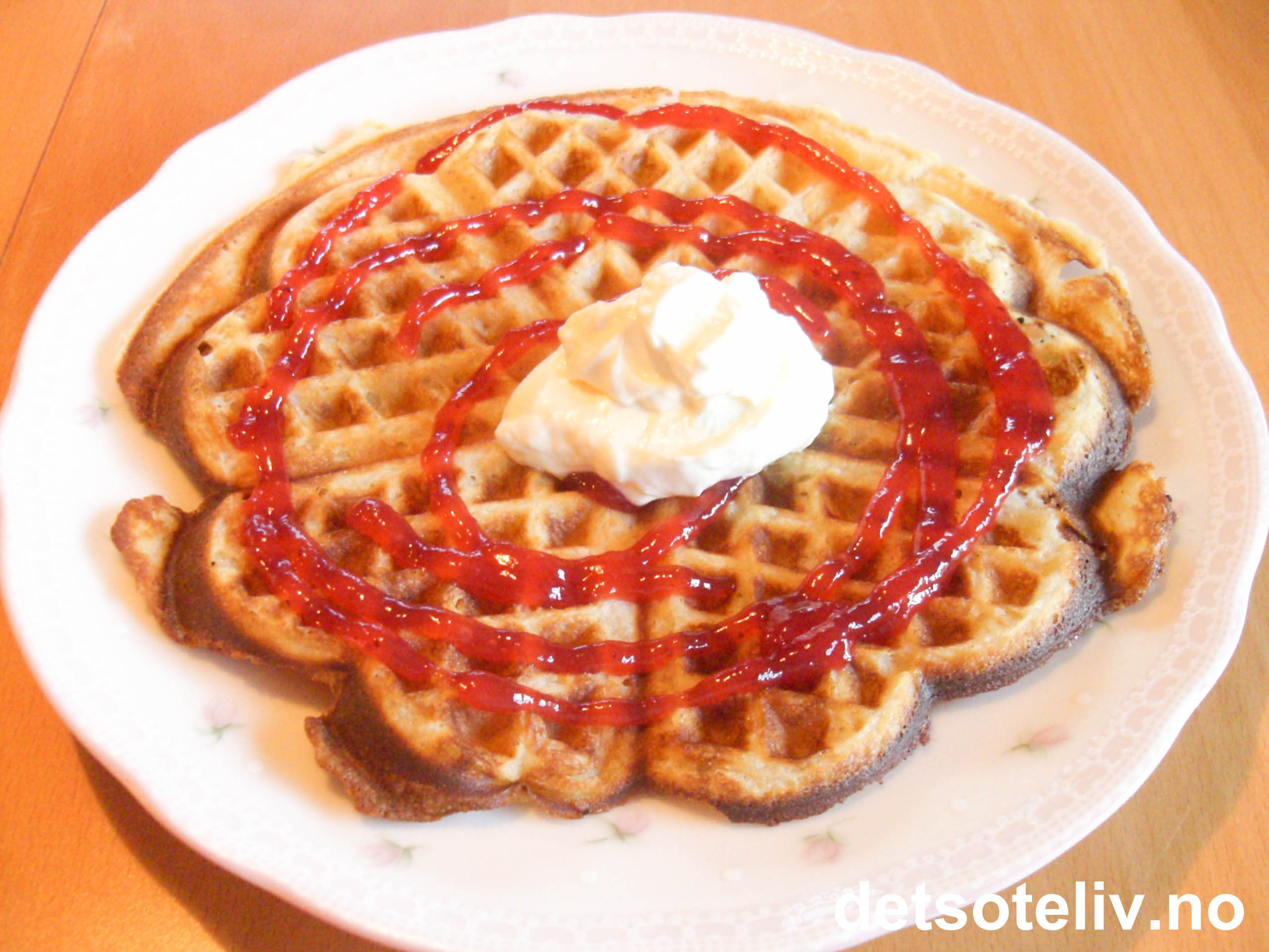 Vaflene smaker best nysteke, gjerne sammen med seterrømme og syltetøy.