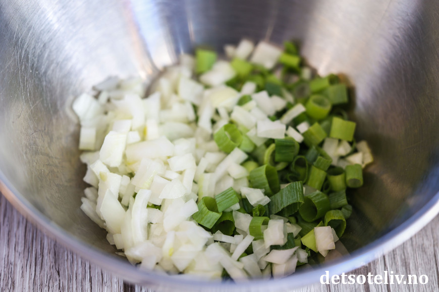 Hakk løk og vårløk. Ha dette i skålen med marinaden. Tilsett lakseterningene.
