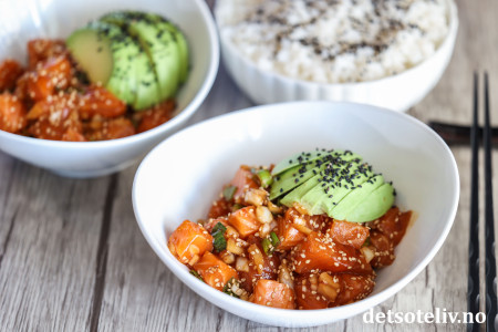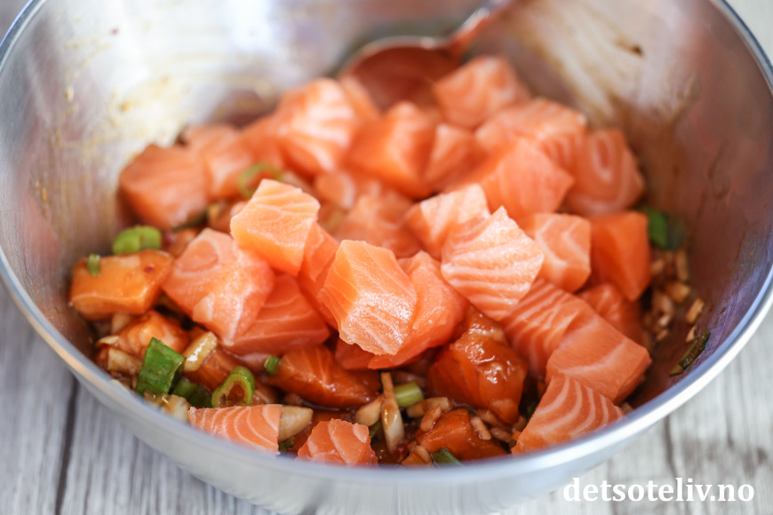 Den kanskje mest vanlige varianten av Shoyu poké lages med rå tunfisk (Shoyu ahi poké), men jeg liker versjonen med rå laks mye bedre.