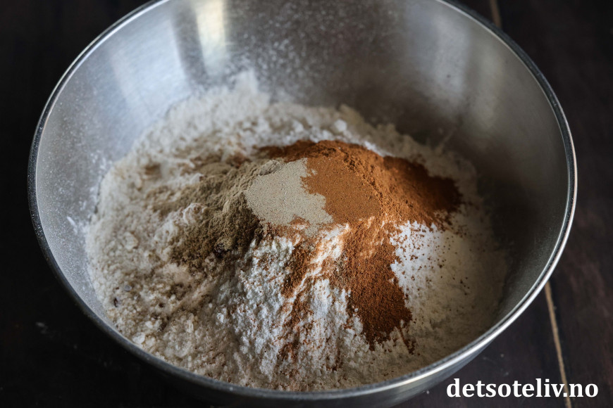 Bland hvetemel sammen med bakepulver, krydder og apsikat.