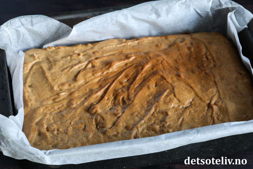 Ha deigen i en bakepapirkledd, liten langpanne (ca. 20 x 30 cm). Stek kaken midt i ovnen ved 180°C i ca. 30 minutter.