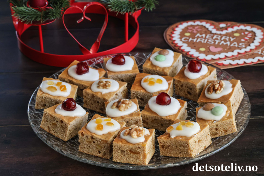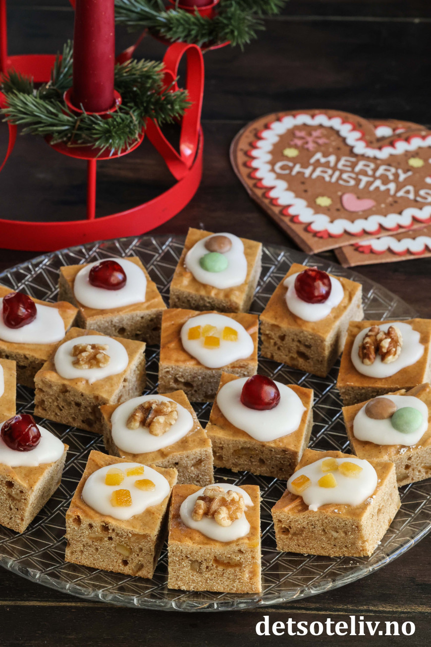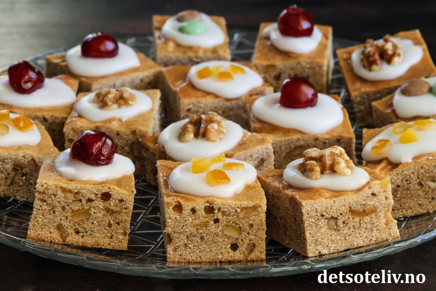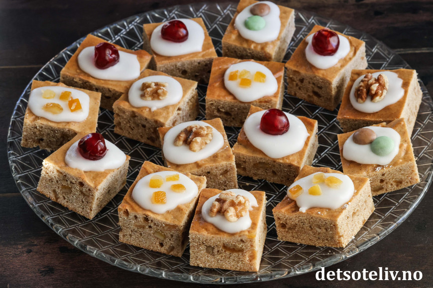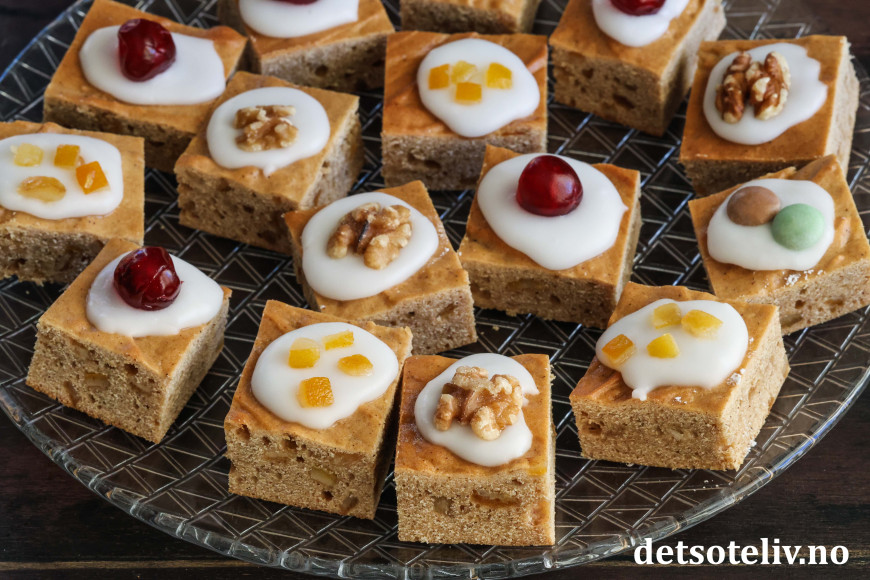 Bitene blir myke og kompakte og smaker veldig godt av krydder, apsikat og sirup. Pynter du med litt melisglasur og nøtter, cocktailbær, apsikat eller non stop, ser kakestykkene ekstra fristende ut på fatet.