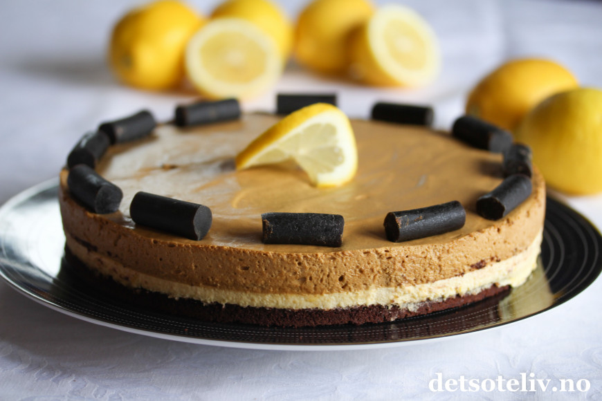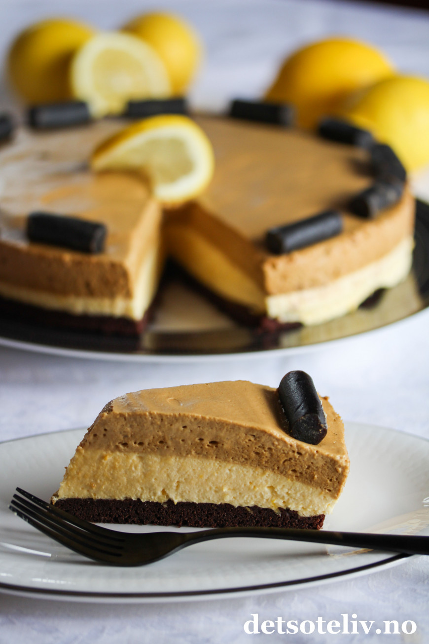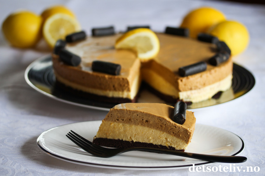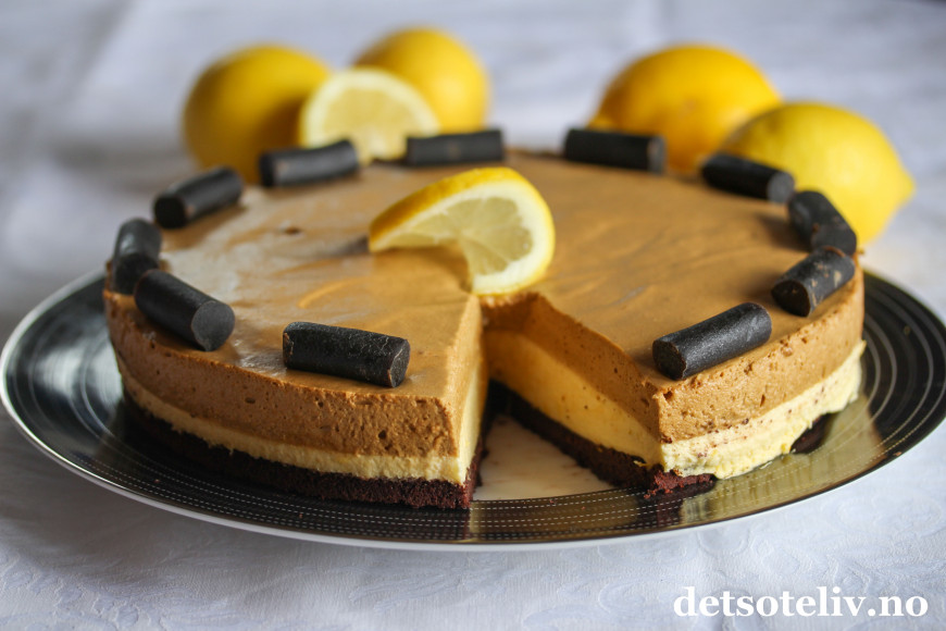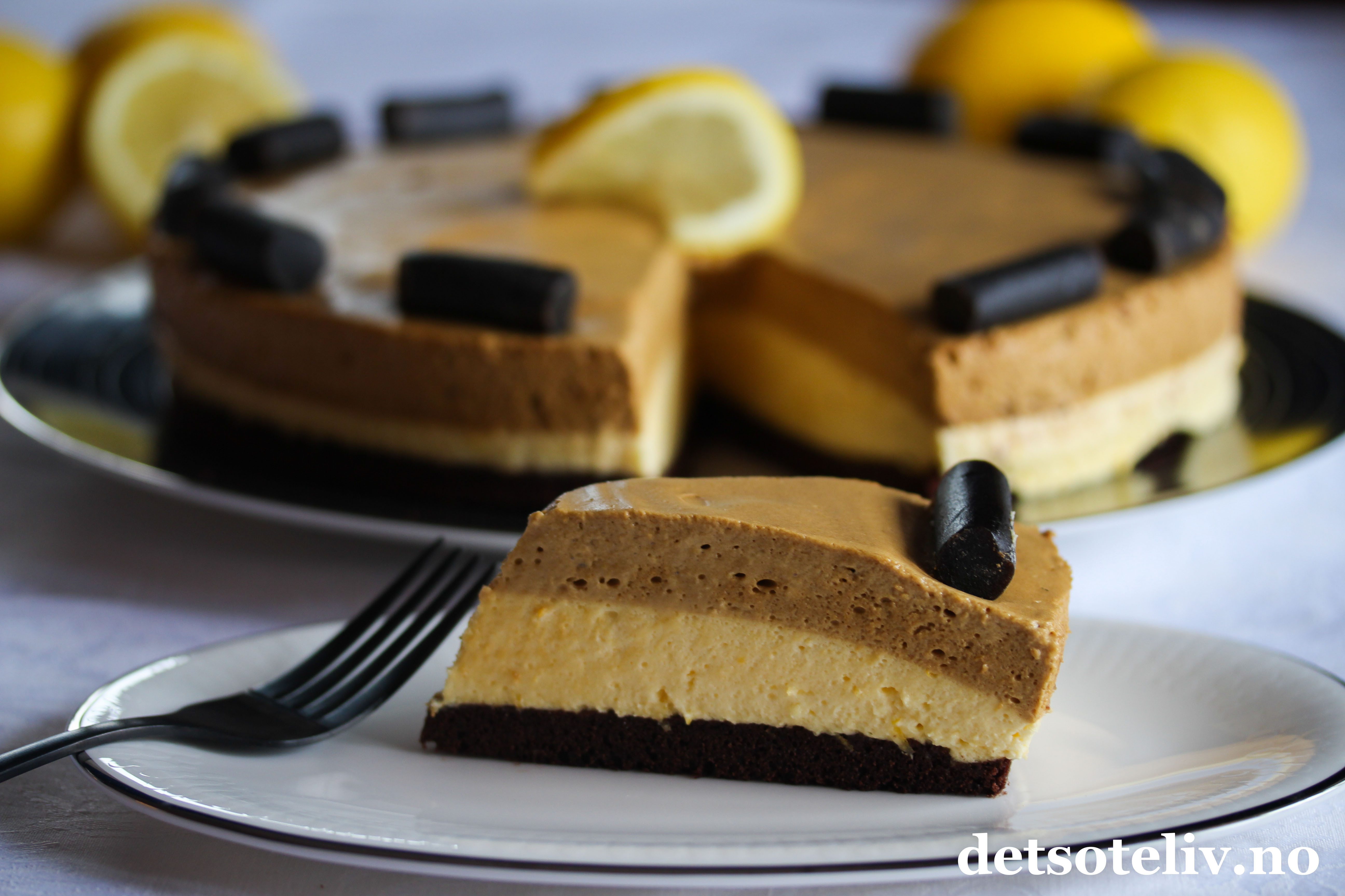Kombinasjonen sitron og lakris er fantastisk god! Derfor har jeg komponert denne fromasjkaken som består av en tynn sjokoladekakebunn som dekkes av både et lag sitronfromasj og et lag lakrisfromasj.