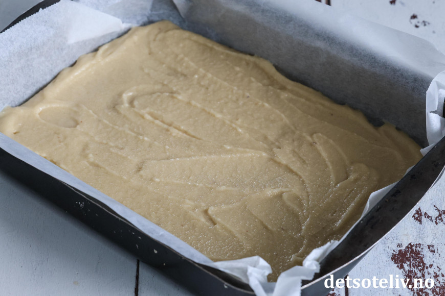 Fordel marsipandeigen utover i en liten, bakepapirkledd langpanne (ca. 20 x 30 cm).