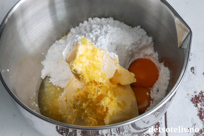 Ha romtemperert smør i en bolle sammen med melis, vaniljesukker, eggeplommene og presset saft og revet skall av sitronen.