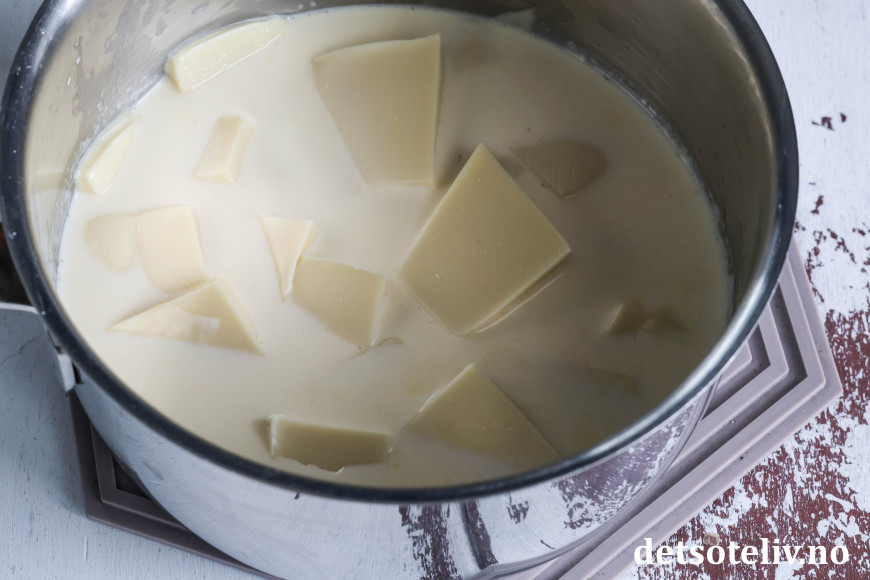 Ha fløten i en liten kjele og gi den et oppkok. Ta kjelen av platen og tilsett oppdelt, hvit sjokolade.