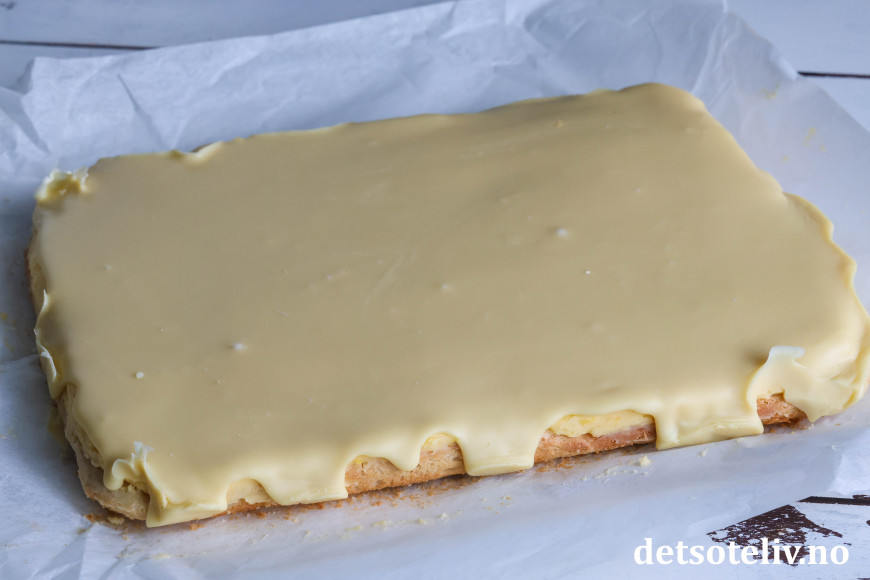 ♥ Det er viktig at den hvite sjokoladeglasuren ikke er for varm når du brer den over sitronkremen, igjen for å hindre at sitronkremen smelter. Av samme grunn er det viktig at kaken står kjølig lenge slik at sitronkremen har stivnet før du smører på den hvite sjokoladeglasuren.
