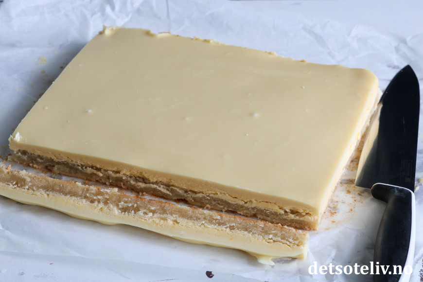 Renskjær kantene på kaken og skjær kaken deretter i små firkanter.