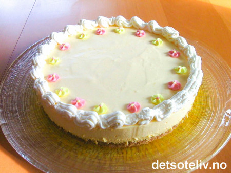 Skjær forsiktig langs kakeringen med en kniv og fjern kakeringen. Pynt kaken etter ønske, f.eks. med sprøytet krem og sukkerblomster.