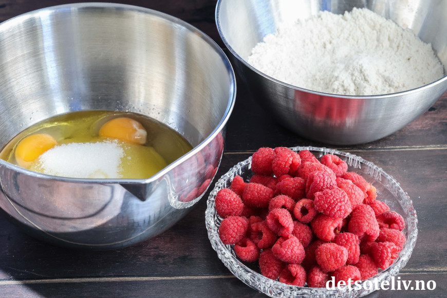 Finn frem bringebærene. Sett til side 40 gram av bringebærene. Vend resterende 160 gram av bringebærene sammen med 2 ss hvetemel (dette forhindrer at bringebærene synker til bunns kaken under stekingen).