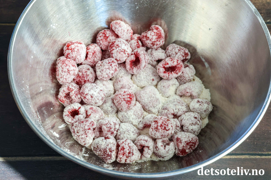 Sett til side 40 gram av bringebærene. Vend resterende 160 gram av bringebærene sammen med 2 ss hvetemel (dette forhindrer at bringebærene synker til bunns kaken under stekingen).