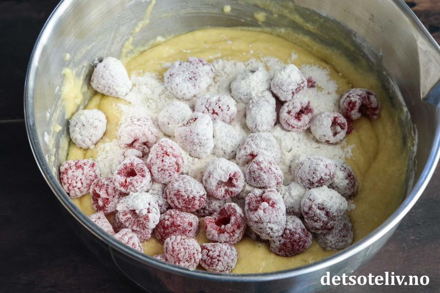 ♥ Jeg anbefaler å bruke friske bringebær til denne kaken. Dersom du likevel bruker frosne bringebær, trenger de ikke å tines før du vender dem inn i deigen.