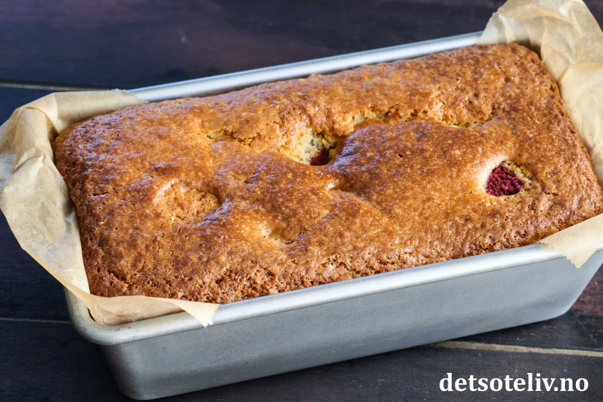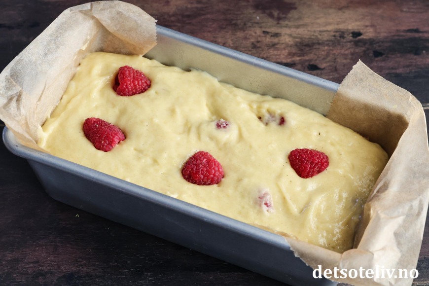 Ha deigen i en liten brødform (som rommer 1 liter) som er kledd med bakepapir. Legg et par bringebær på toppen (resten av bringebærene sparer du til pynt).
