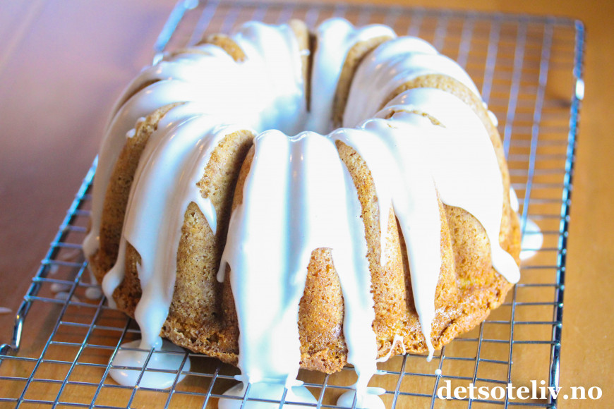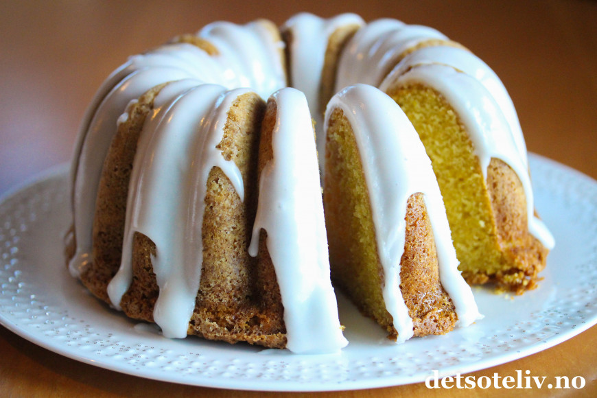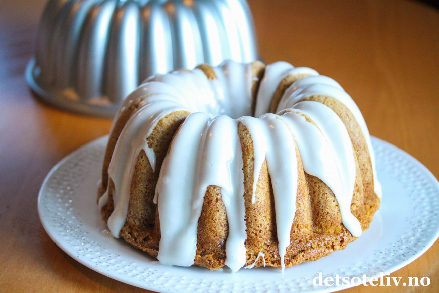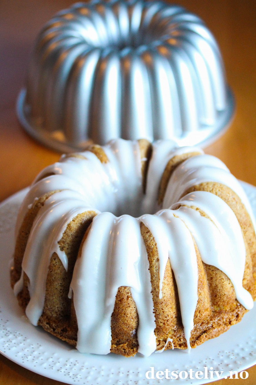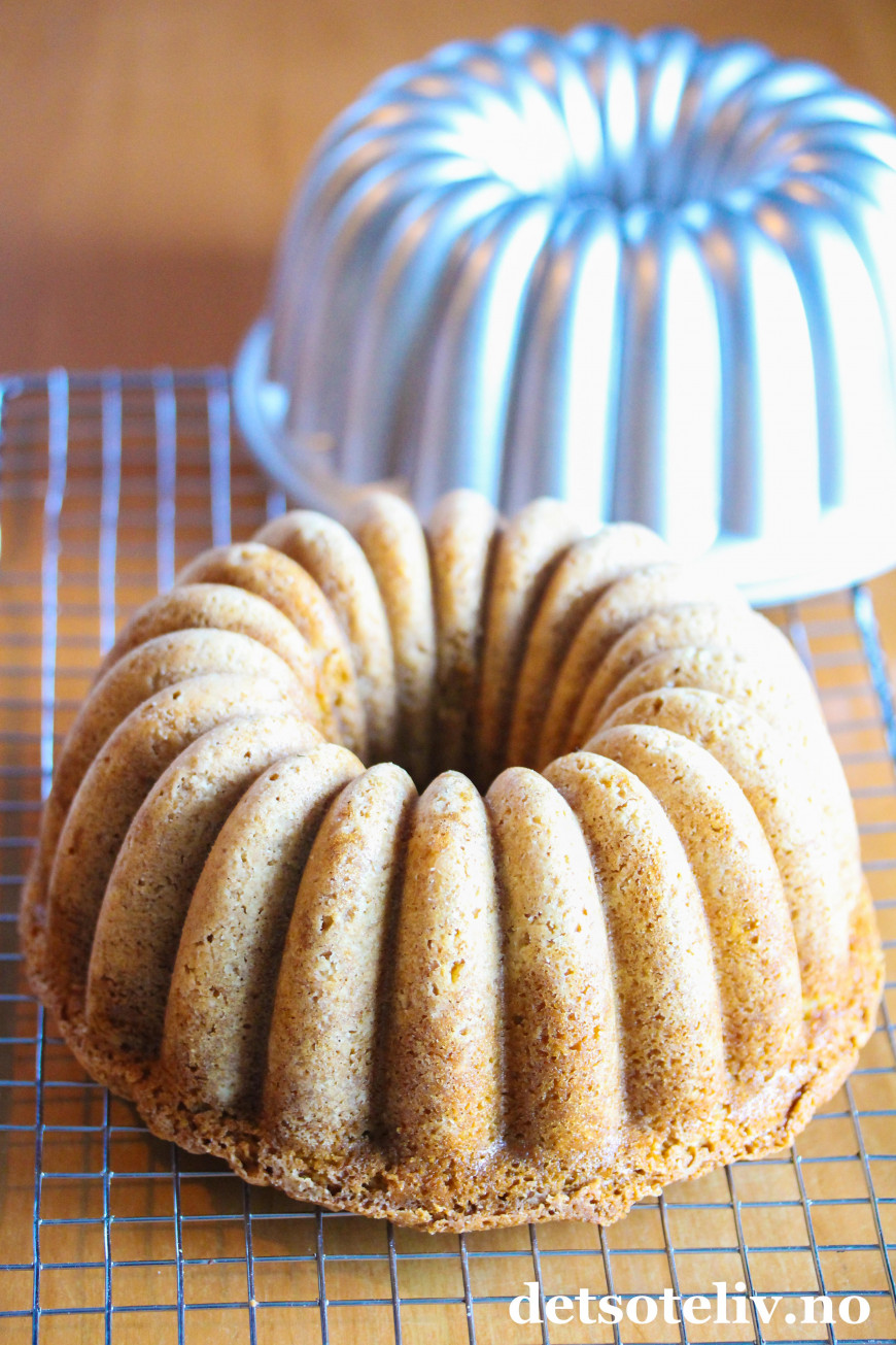 ♥ Jeg brukte her som sagt en form fra Nordic Ware (Elegant Party Bundt), og den rommet 2,3 liter og da passet deigen helt perfekt til formen. Den hevet seg helt til toppen av kaken under stekingen, men uten å renne over. Andre formkakeformer kan selvsagt også brukes, men husk at formen bør romme 2,5 liter for at du skal være sikker på at deigen passer til formen.