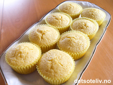"Sitronmuffins" kan eventuelt pyntes med litt glasur laget av melis utrørt i vann eller sitronsaft.