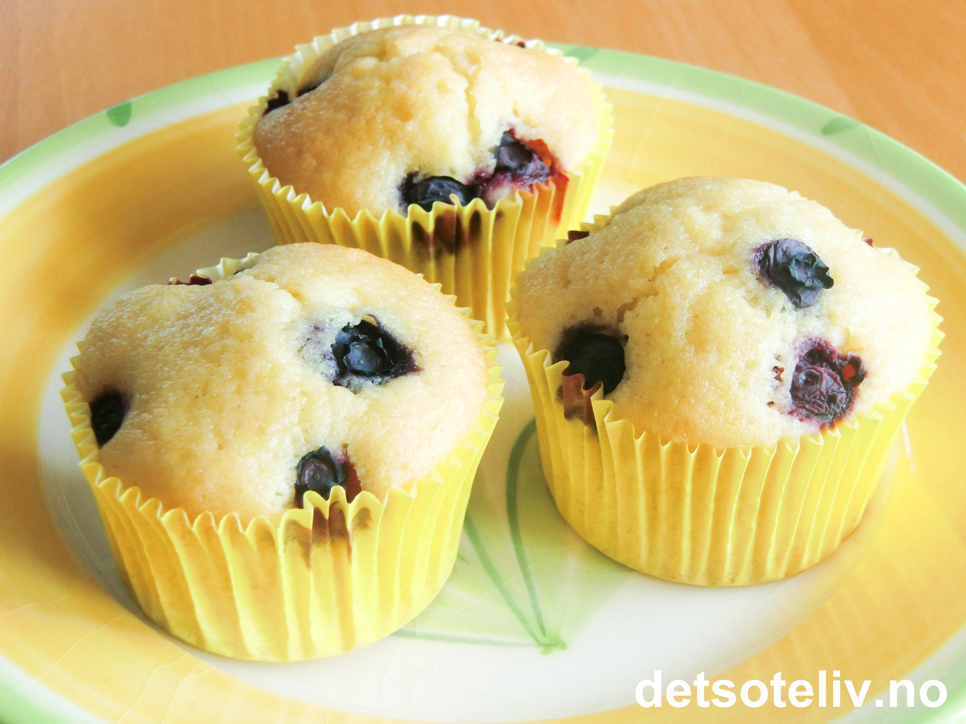 Blåbærene du vender inn i deigen har en tendens til å synke ned i bunnen på muffinsene under steking, derfor er det lurt å legge en del av blåbærene på toppen av muffinsene etter at du har hatt deigen i formene.